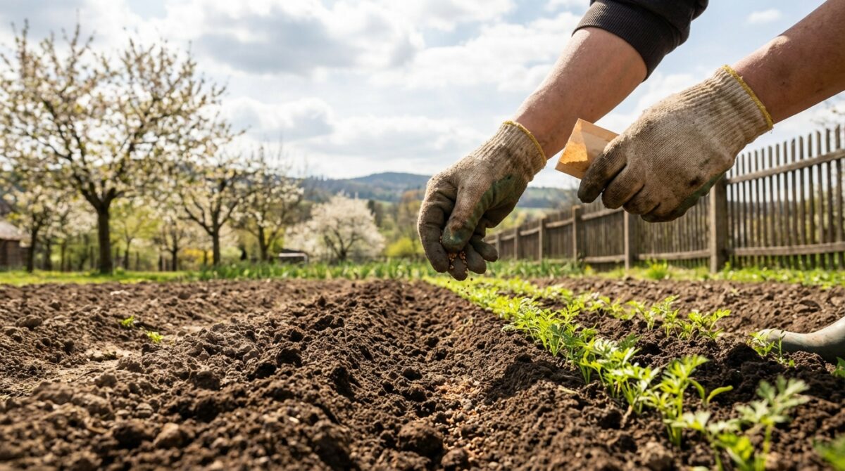 Klíčení v březnu je pomalejší, proto jsem začal věnovat větší pozornost přípravě půdy. Kypril jsem ji do hloubky 20 až 25 cm, aby kořínky měly dostatek prostoru pro růst. Vyhýbal jsem se kamenům a těžkým místům, která mrkev nesnáší.